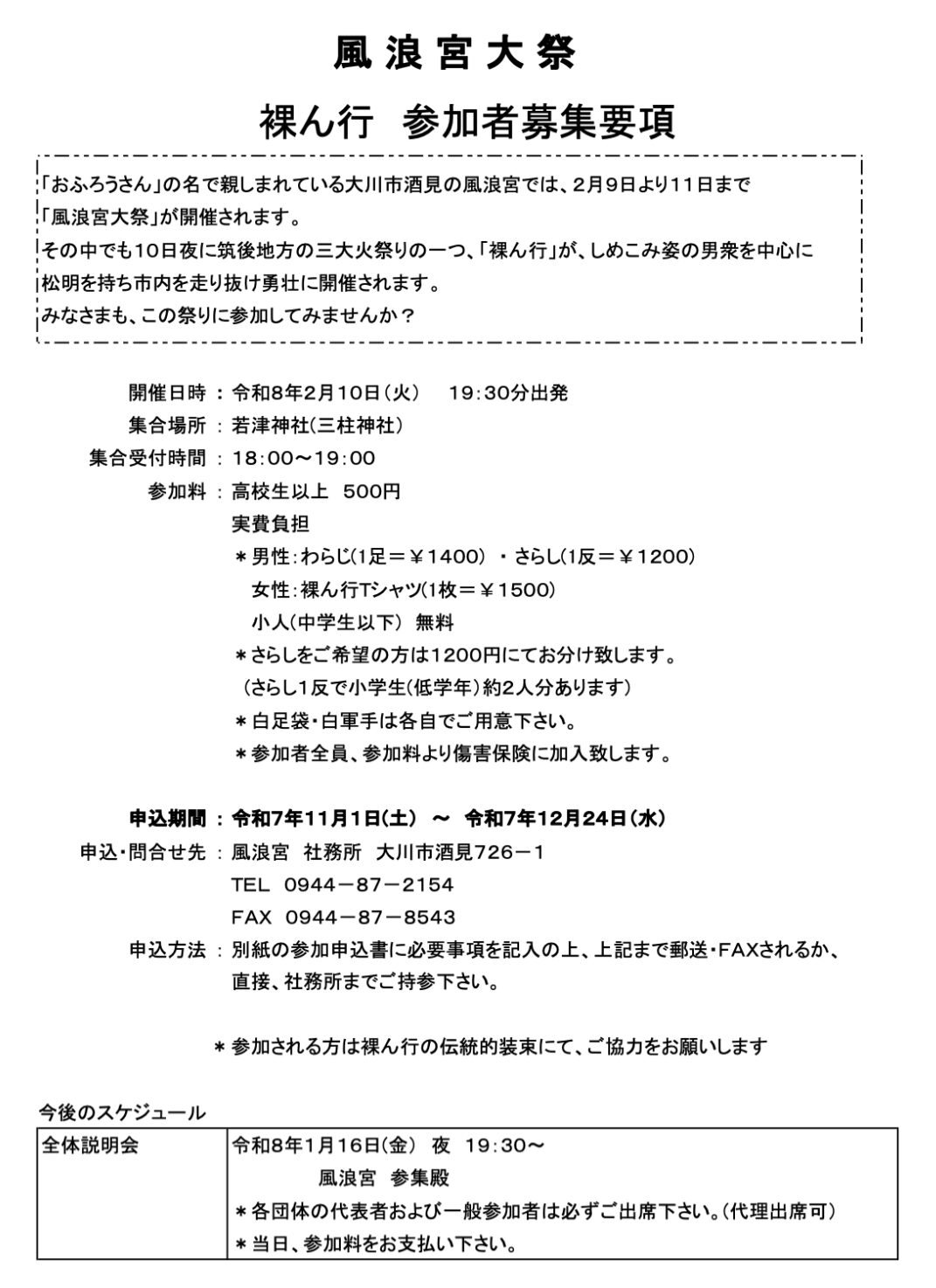 風浪宮大祭の神事の一つであり、筑後地方三大火祭りとして知られる「裸ん行」につきまして、裸ん行実行委員会が本年度の参加者を募集されています。